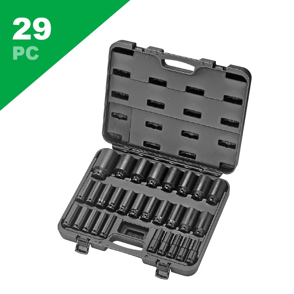 29 PC 1/2"Dr. Deep Impact Sockets: 10, 11, 12, 13, 14, 15, 16, 17, 18, 19, 20, 21, 22, 23, 24, 25, 26, 27, 28, 29, 30, 32, 33, 34, 35, 36, 38, 41, 46mm