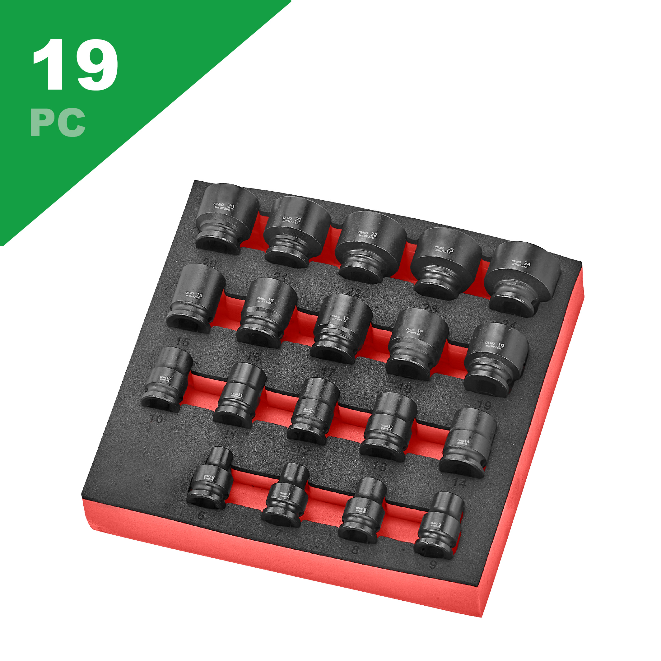 19 PC 3/8"Dr. STD Impact Sockets: 6, 7, 8, 9, 10, 11, 12, 13, 14, 15, 16, 17, 18, 19, 20, 21, 22, 23, 24mm